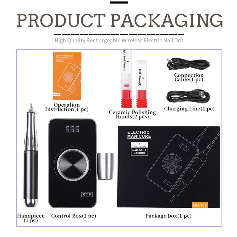 Isi dari paket bor kuku elektrik eksfoliasi 35.000 rpm ini meliputi produk pena amplas, kabel charger USB, buku petunjuk produk, dan box yang ringan dan portabel.