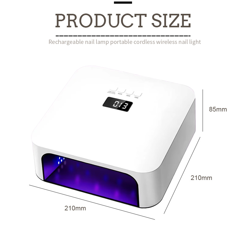 Dimensi lampu pengering kuku cepat berkualitas tinggi ini adalah panjang 210 mm, lebar 210 mm, dan tinggi 85 mm, dengan kapasitas besar dan kemampuan menggunakan kedua tangan dan kaki yang sangat nyaman.