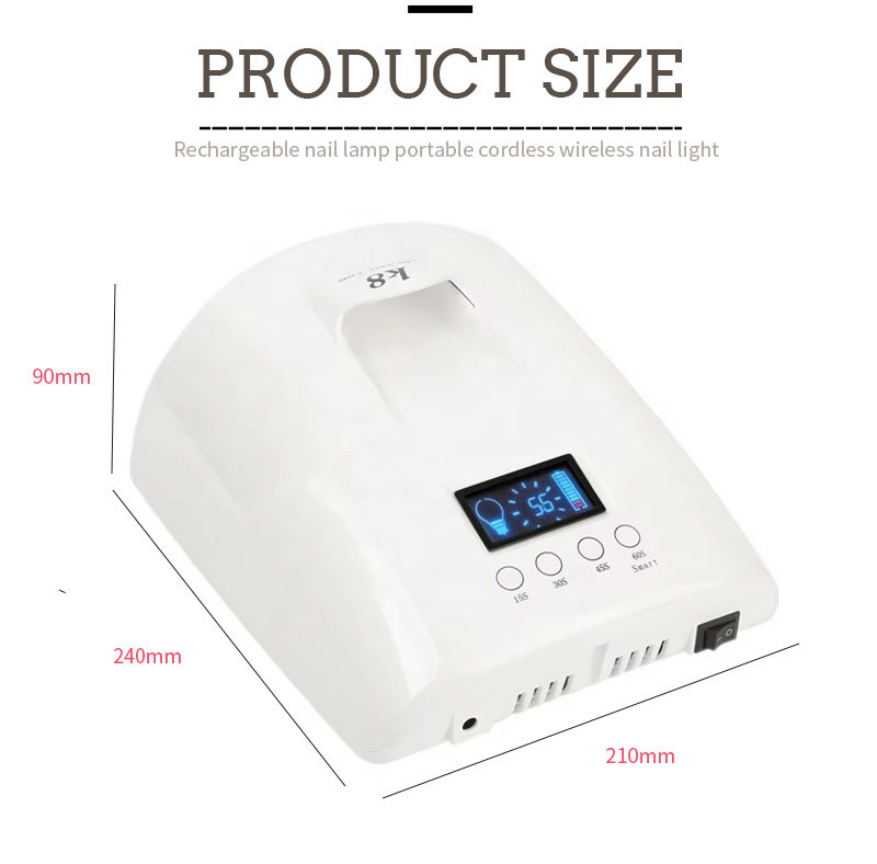 Dimensi lampu pengering kuku berkapasitas besar dengan gagang ini adalah panjang 205 mm, lebar 220 mm, dan tinggi 104 mm, dengan kapasitas besar dan kemampuan menggunakan kedua tangan dan kaki yang sangat nyaman.