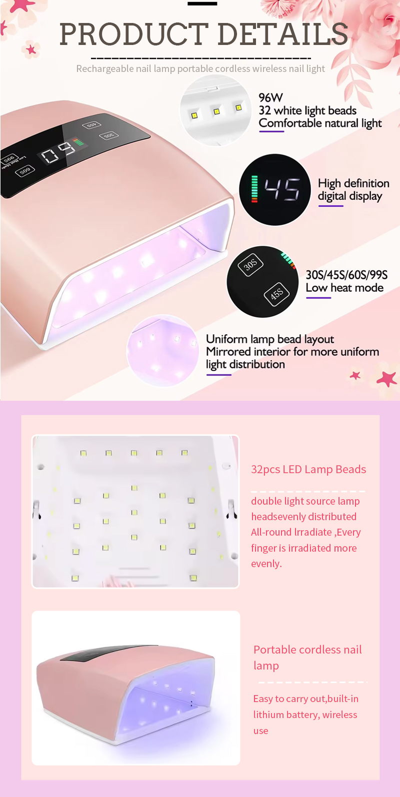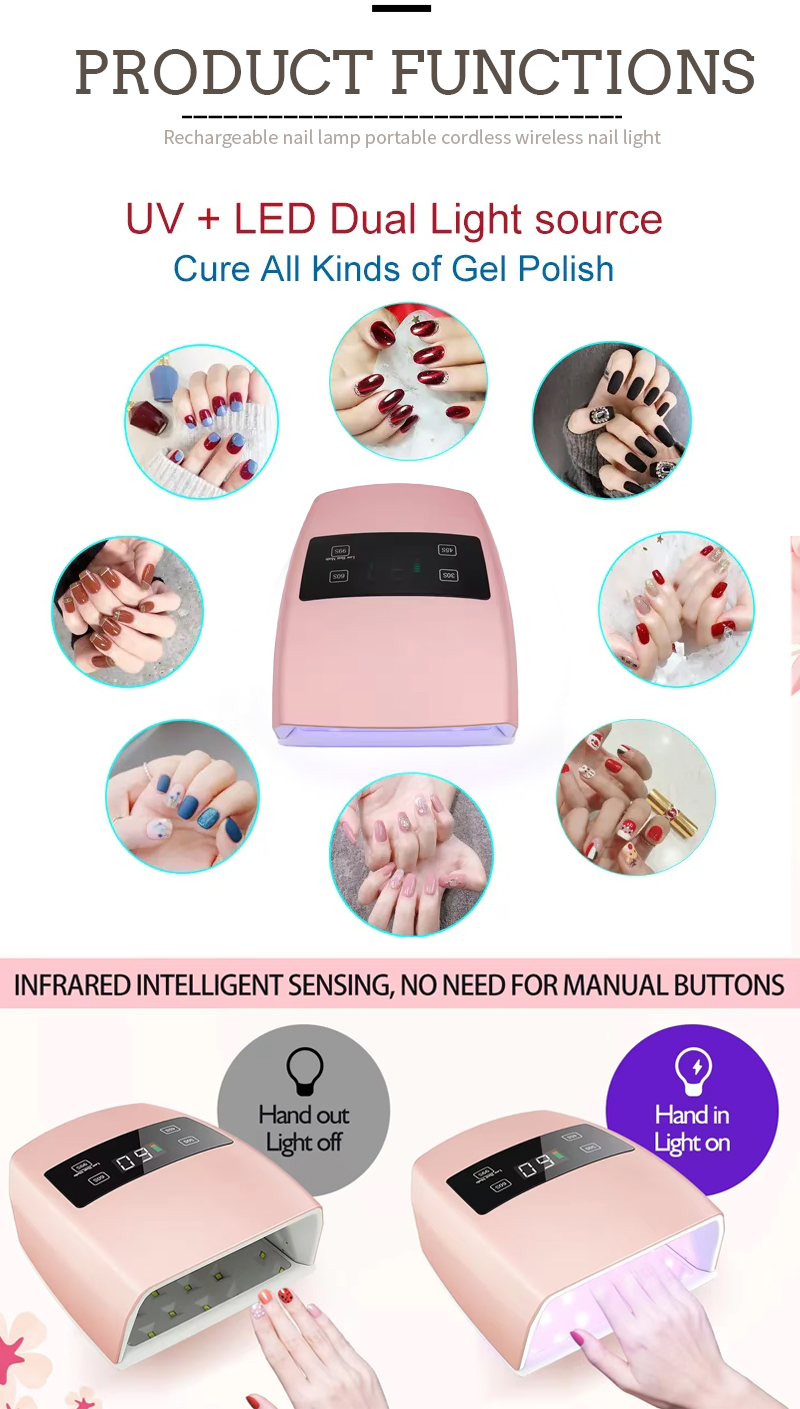 Produk ini memastikan pengeringan lem merata tanpa penyusutan. Sumber cahaya gandanya memberikan pemanasan lembut untuk mencegah perubahan warna pada tangan dan ketegangan mata, cocok untuk tangan dan kaki, memberikan hasil pengeringan yang sangat cepat.