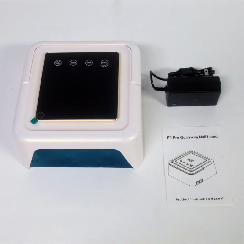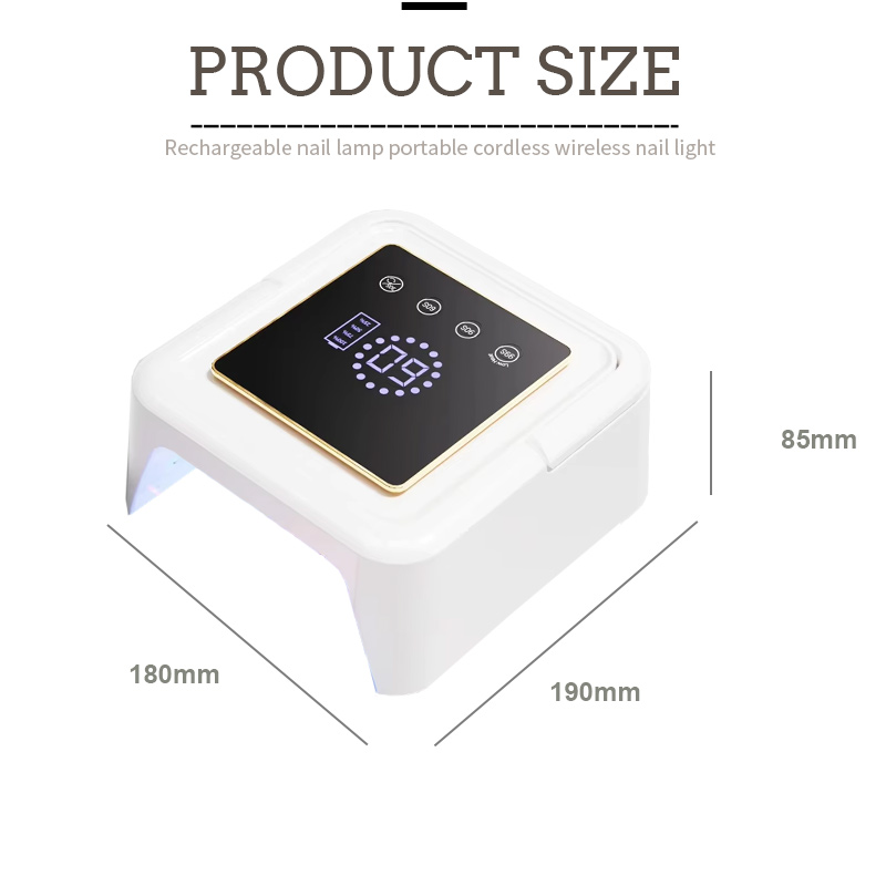 Dimensi lampu pengering kuku berbentuk persegi ini adalah panjang 180 mm, lebar 190 mm, dan tinggi 85 mm, dengan kapasitas besar dan kemampuan menggunakan kedua tangan dan kaki yang sangat nyaman.