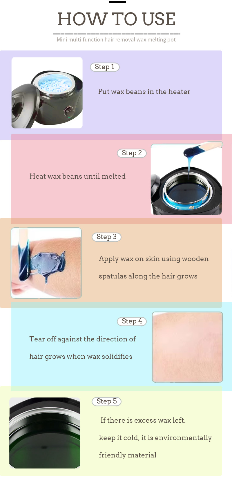 Metode operasi produk lilin obat menghilangkan rambut, semakin tinggi suhu semakin cepat lilin meleleh, semakin rendah suhu semakin lambat lilin meleleh, pertama tuangkan ke dalam jumlah biji lilin obat menghilangkan rambut yang sesuai, panaskan sampai biji lilin meleleh, kemudian bagian obat menghilangkan rambut dari lilin obat menghilangkan rambut yang dilapisi secara seragam, dan akhirnya berlawanan dengan arah pertumbuhan rambut, sobek.